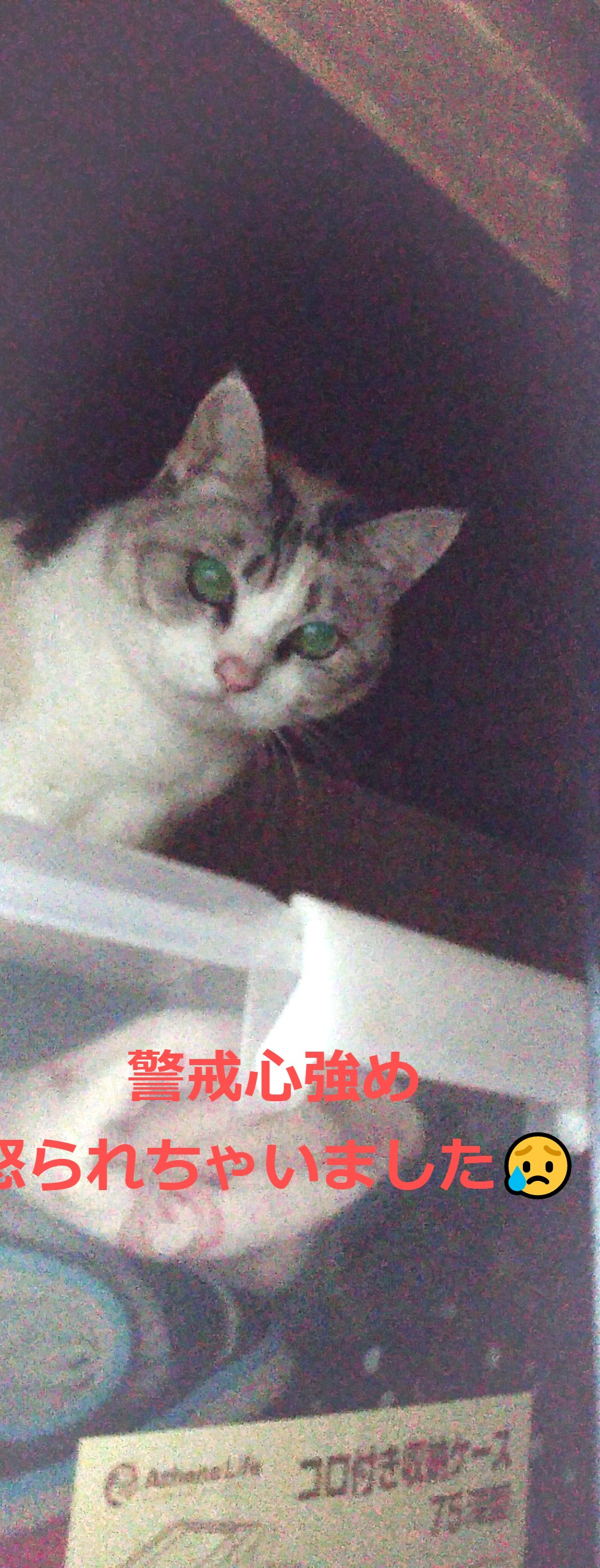 まずは三毛猫のうぅあちゃん。気にはなるけど怖いのとお姉ちゃんで守らないとと思ったのかめっちゃ"フー💢💢💢"と怒られてしまいました💦💦